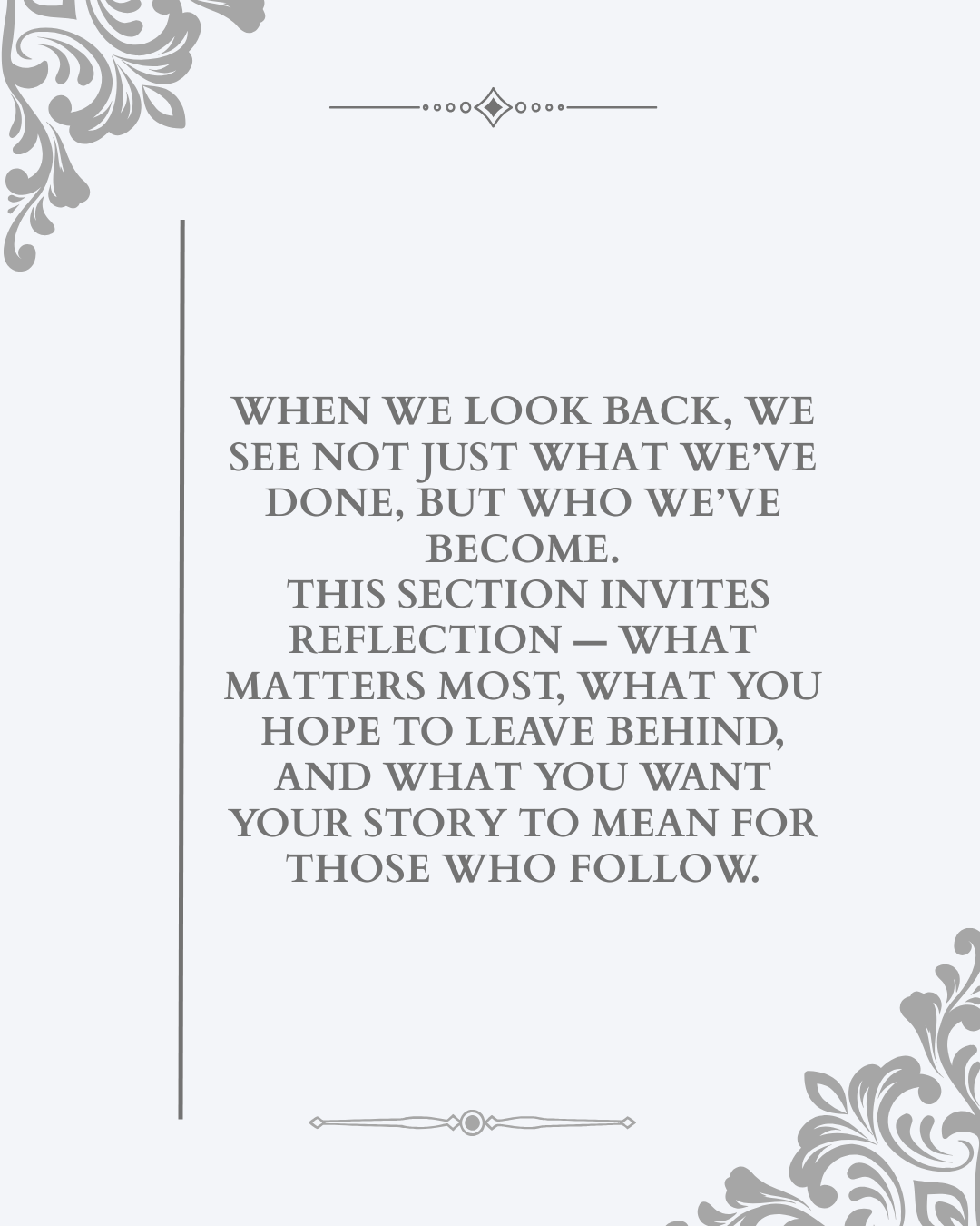Guided Prompts: Over 100 meaningful questions about childhood, family memories, personal milestones, and life lessons.