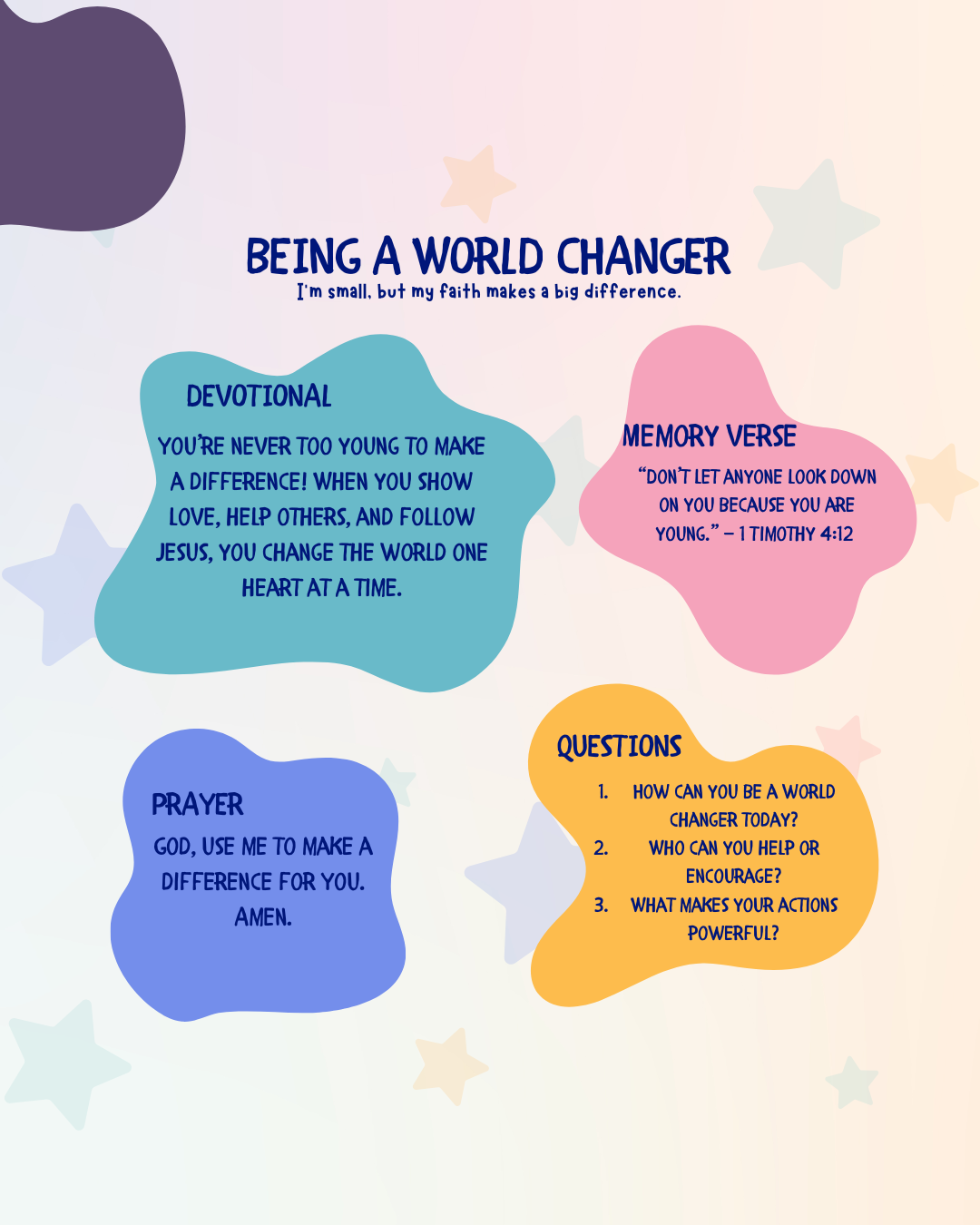 Each short, engaging devotion helps kids discover how to live with kindness, courage, and purpose. Through relatable stories, Bible verses, simple prayers, and reflection questions, children will learn how to invite Jesus into their everyday moments — from choosing the right friends to handling mean behaviour, showing gratitude, managing emotions, and building strong faith habits.